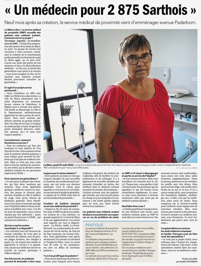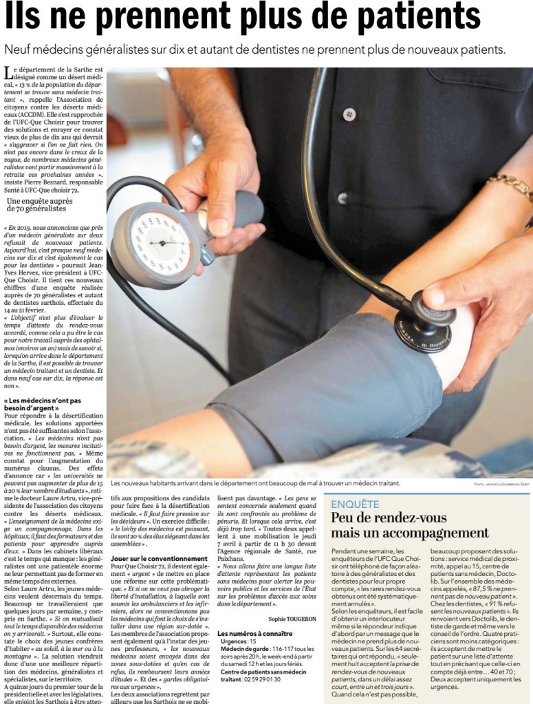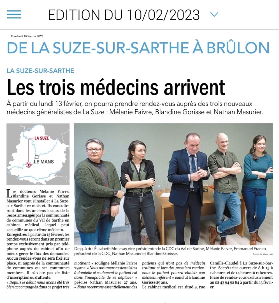 La presse locale fait état de la situation médicale et du fait que la plupart des médecins (et des dentistes.) ne prennent plus de patient ! Vous trouverez aussi ci-dessous des articles sur des organisations locales, les équipements mis à disposition par la pharmacie de Guécélard, l’installation de médecins à la Suze…