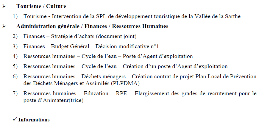 La présentation du rapport d’activités de la SPL (Société Publique Locale) de développement touristique de la Vallée de la Sarthe a été conduite en début de séance. Créé en 2018, la SPL travaille sous convention de 3 ans en cours (2022-2024) pour 3 communautés de communes (LBN, Pays Sabolien et VDS). Pas de délibération ni de vote sur ce sujet.