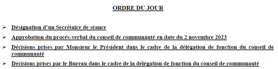 La réunion du conseil de la Communauté de Communes du Val de Sarthe s’st tenue le Jeudi 14 décembre 2023 à 20h30, Salle polyvalente à Etival lès le Mans
