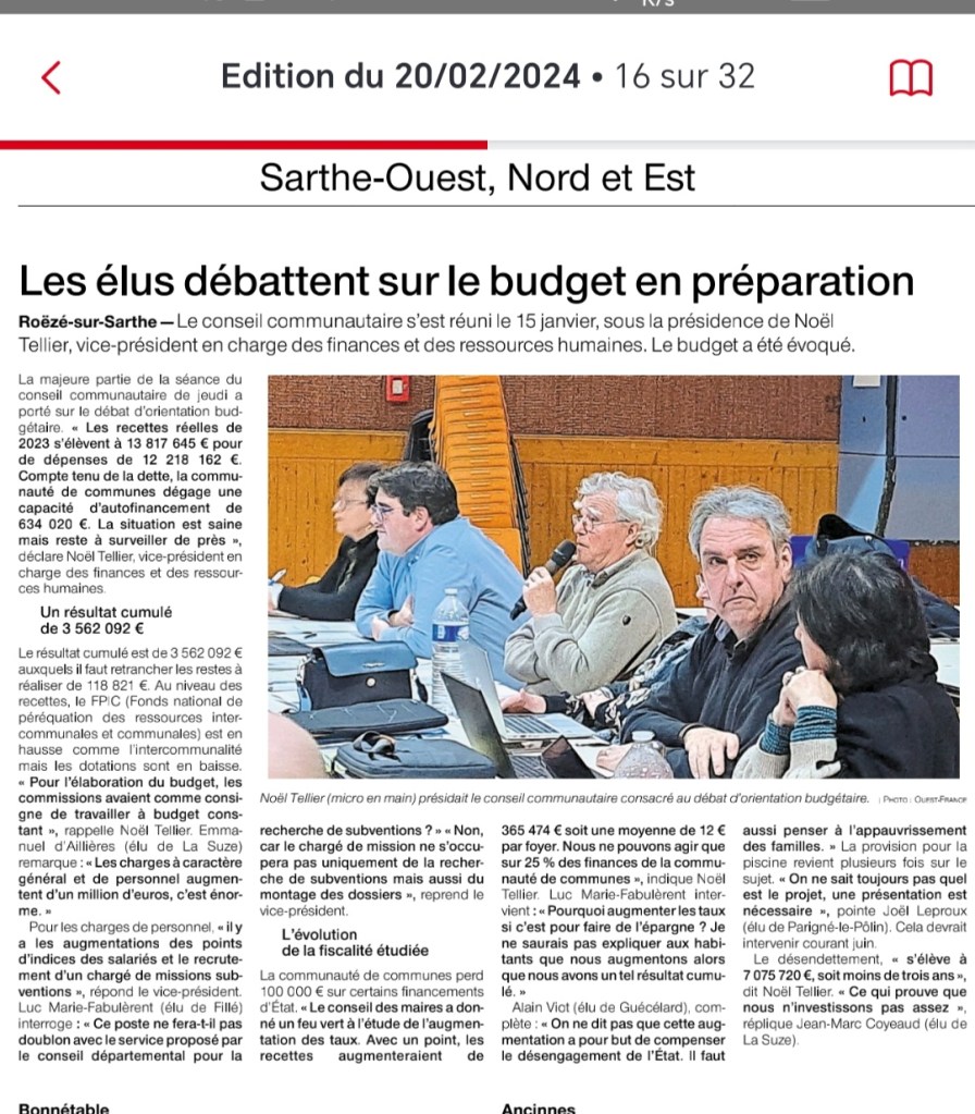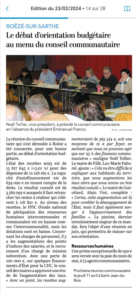 La réunion du conseil de la Communauté de Communes du Val de Sarthe s’est tenue à la salle polyvalente de Roëze sur Sarthe le jeudi 15 février à 20h30.
