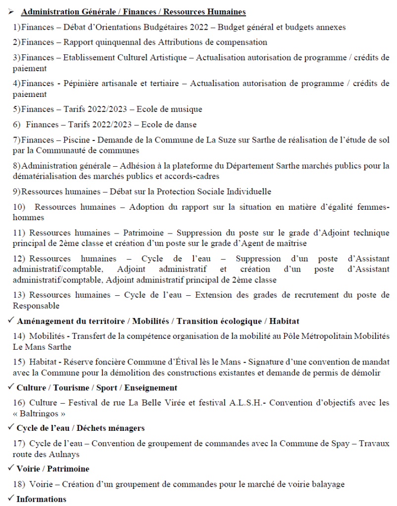 Les autres dossiers vont être traités beaucoup plus rapidement d’où la nécessité d’avoir potassé les dossiers en amont. Quelques points à retenir : les tarifs pour la nouvelle école de danse communautaire ont été fixés pour la prochaine rentrée 2022/23, l’étude de sol du terrain proposé par La Suze pour accueillir la piscine vient d’être lancée, la création d’un groupement de commandes pour le marché de voirie balayage est actée.