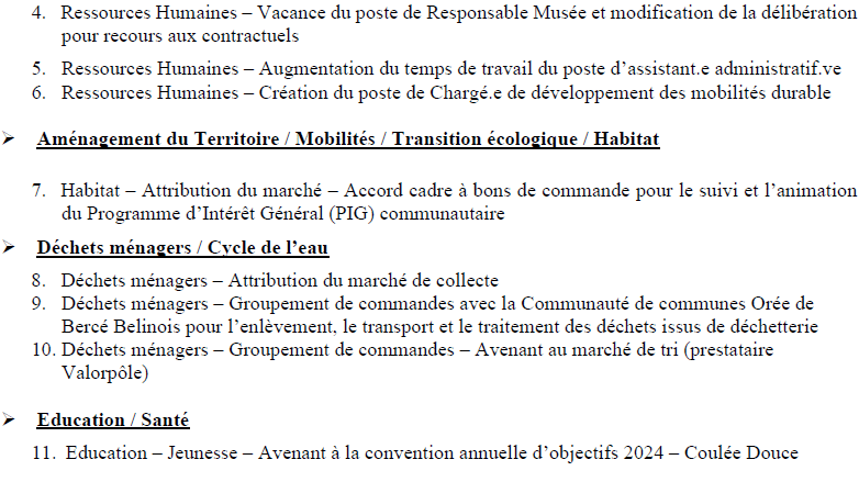 Ressources Humaines : Diverses évolutions de postes d’emploi ont été décidées ainsi que la création du poste de Chargé de de développement des mobilités durables à pourvoir au 1er octobre 2024 (évolution de la délibération de mai 2024).