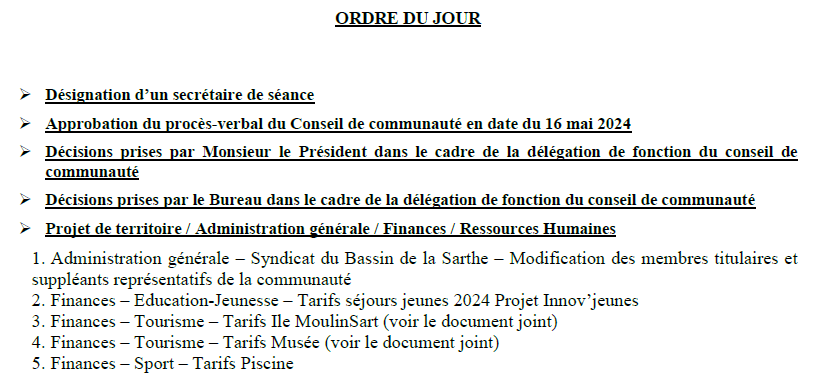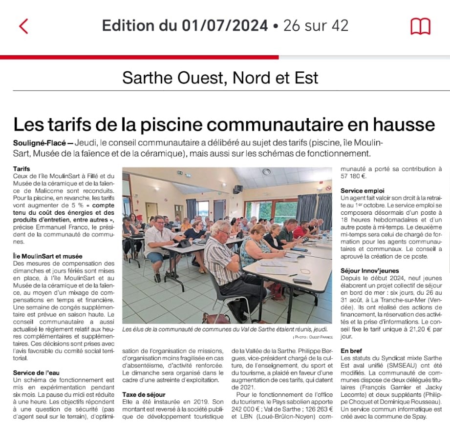 La réunion du conseil de la Communauté de communes du Val de Sarthe s’est tenue le Jeudi 27 juin 2024 à 20h30, salle polyvalente à Souligné-Flacé.