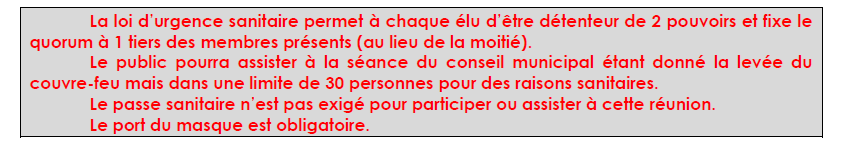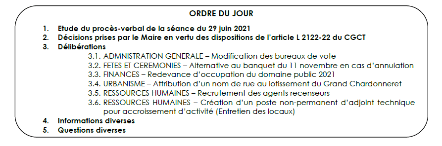 Le conseil municipal s’est déroulé à 20h30 le 14 septembre 2021 à la salle des fêtes.