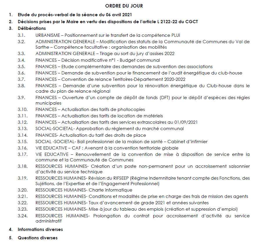 A noter entre autre dans les informations diverses, l’organisation de la journée de l’environnement le 5 juin, la tenue des élections départementales et régionales de juin et la décision de ne pas organiser la fête de la musique au regard des contraintes sanitaires.