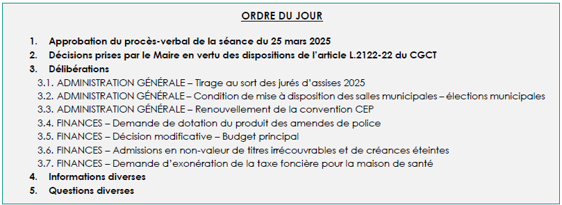 Le conseil municipal s’est réuni le mardi 20 mai 2025 à 20h30 en mairie.